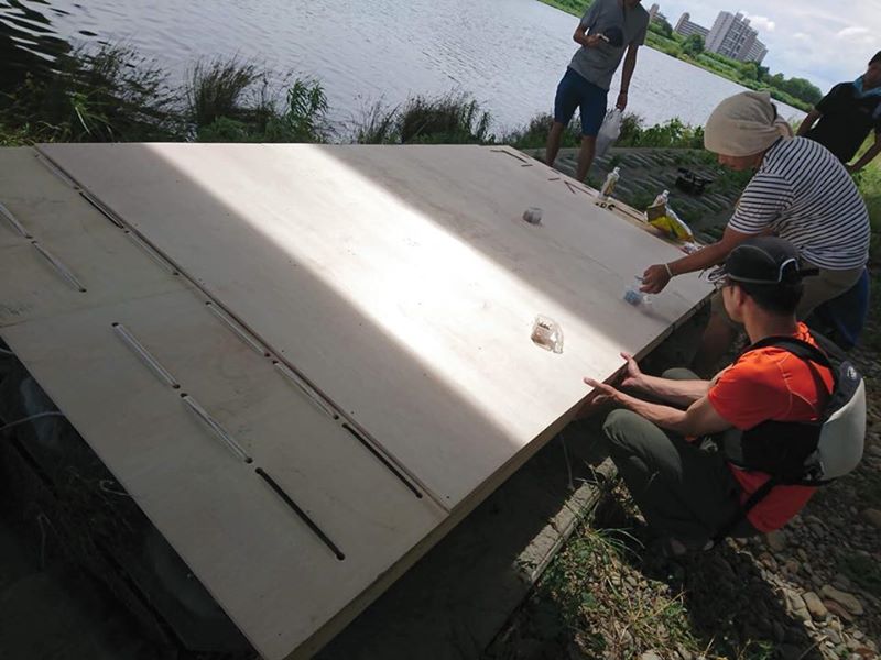集めたケグは32個。これを穴を開けた板に括り付けただけのローコストかつシンプルな筏です。
